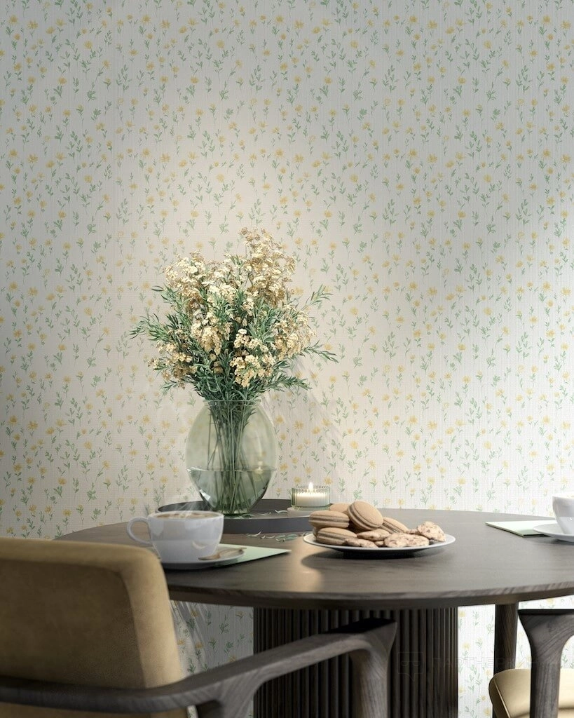 Мелкие цветочные и растительные принты. Современные тренды сделали популярными обои с нежными растительными мотивами — это связано с возросшим интересом к экологичным интерьерам. Одновременно с этим рост популярности стиля мидсенчури вернул актуальность ретрообоям с мелким цветочным узором, характерным для середины XX века.