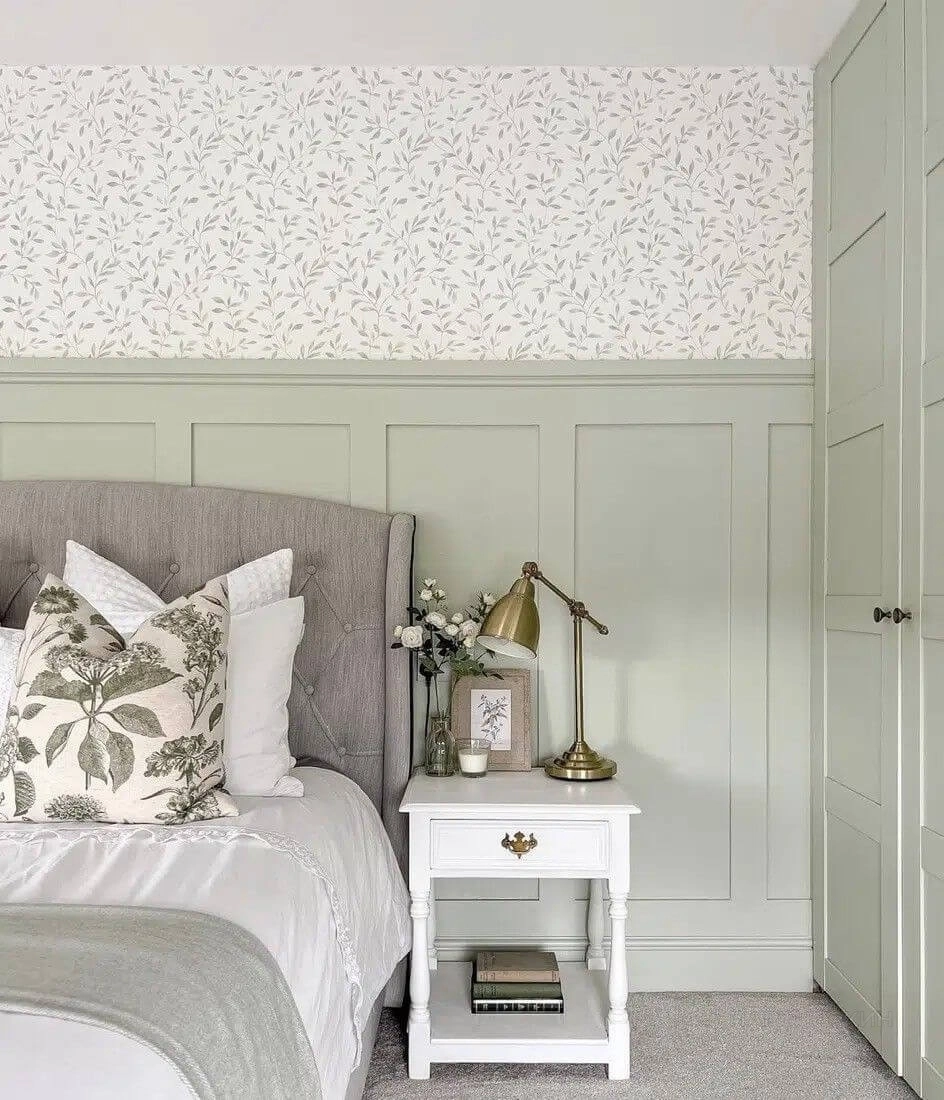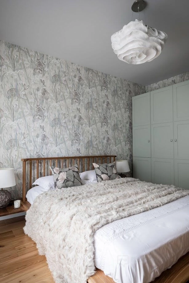Традиционно акцентные обои в спальне используют для оформления стены у изголовья кровати или напротив неё. Но есть и более смелый вариант: оклеить все стены яркими обоями, комбинируя их с панелями в нижней части.