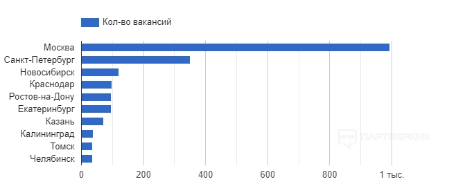 Больше всего вакансий предлагают в Москве, Санкт-Петербурге, Новосибирске и Краснодаре. Уровень ЗП там колеблется в пределах 220 000-290 000 руб/месяц.