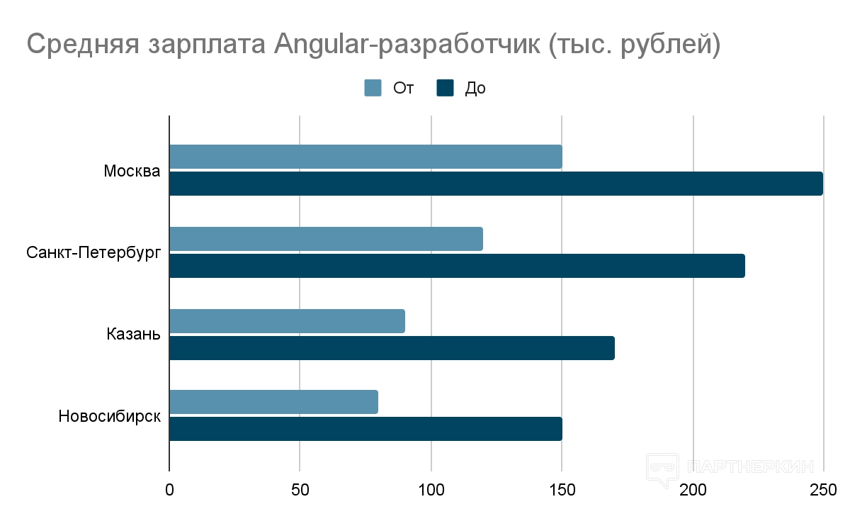 В Москве средняя зарплата Angular-разработчика составляет от 140 000 до 250 000 рублей в месяц, в Санкт-Петербурге – от 120 000 до 220 000 рублей в месяц, в Казани – от 90 000 до 170 000 рублей в месяц, в Новосибирске – от 80 000 до 150 000 рублей в месяц.