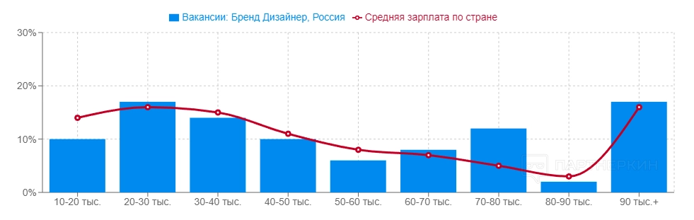 Как и в любой другой профессии, заработок бренд-дизайнеров в РФ и других странах отличается. Если верить порталу Adzuna.ru, средняя зарплата бренд-дизайнера в России составляет 46 503 рубля. Больше всего зарабатывают специалисты Москвы и Санкт-Петербурга. Их ЗП может достигать 90 000 руб/месяц.