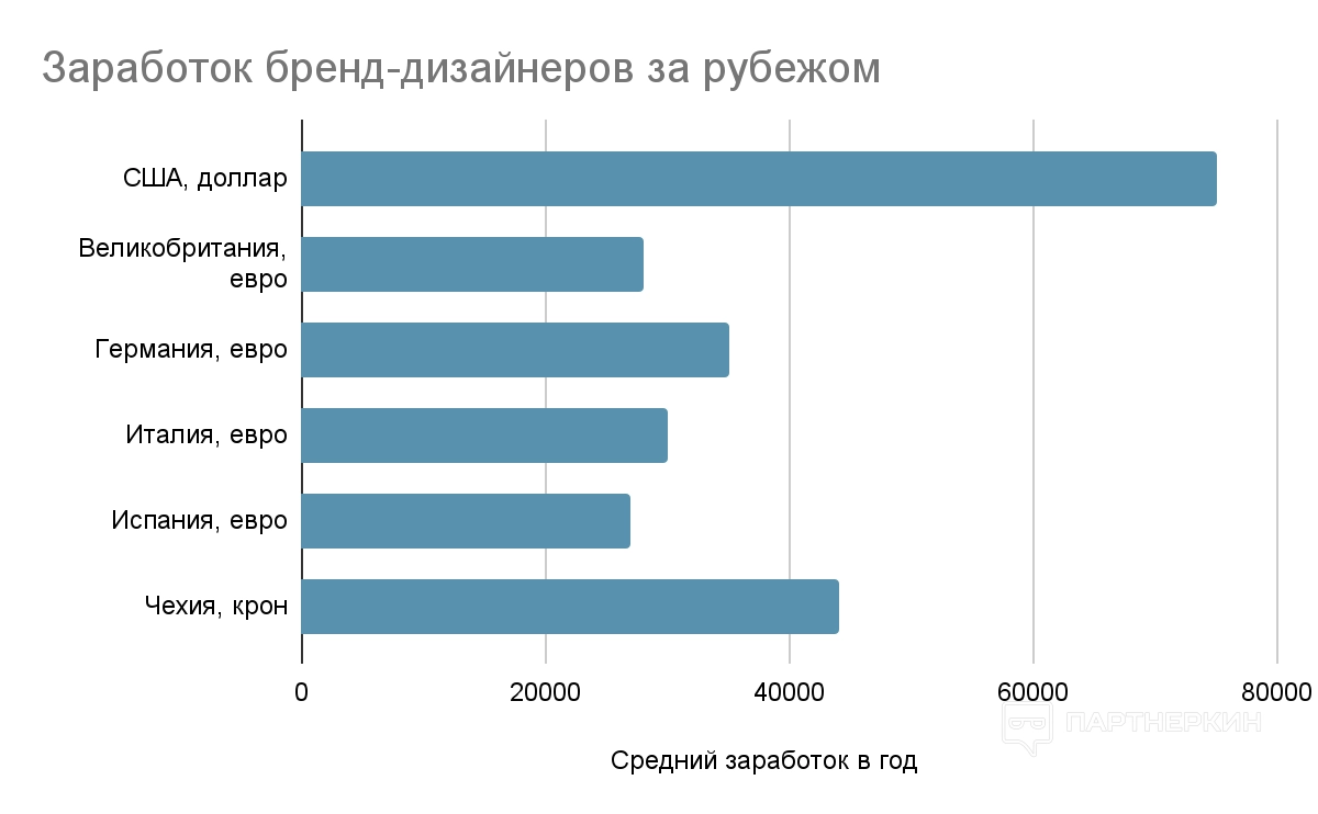 В Америке и Европейских странах зарплаты гораздо выше. Например, в Великобритании начинающие бренд-дизайнеры могут получать до 20 000 £ в год. С опытом 2-3 года ЗП увеличивается до 28 000 £ в год.