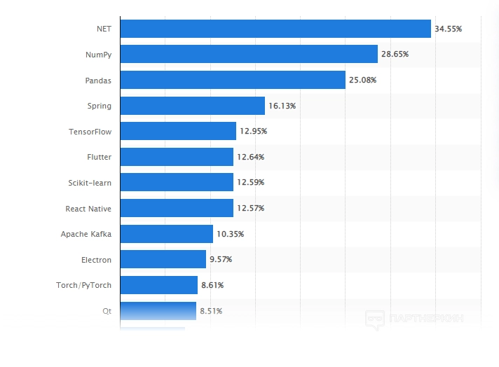 Flutter — молодой, но весьма перспективный фреймворк. Как показывают исследования сервиса Statista, Flutter занимает 7 место в рейтинге лучших платформ для разработки в 2025 году. Хотя в прошлом году фреймворк находился на несколько строчек ниже.