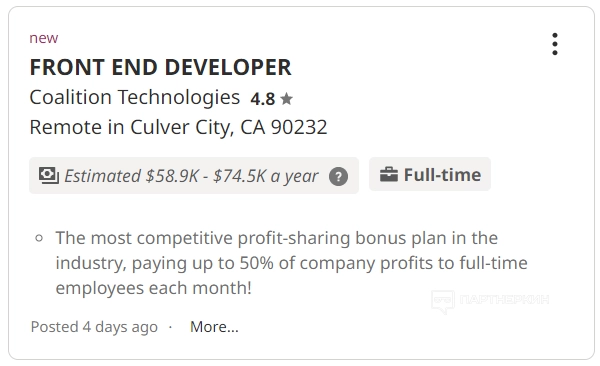 По данным сайта Builtin.com, средняя зарплата Frontend-разработчиков в США составляет 106 071 USD. Можно проверить это на примерах вакансий в разных штатах, а также по Англии — вакансии взяли с сайта indeed.com.