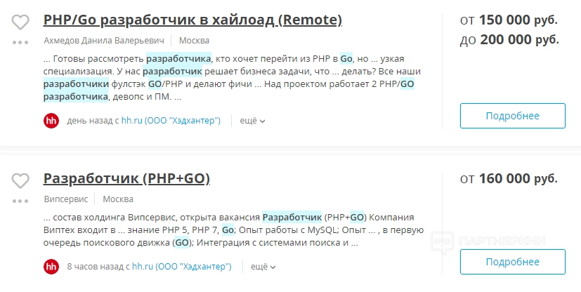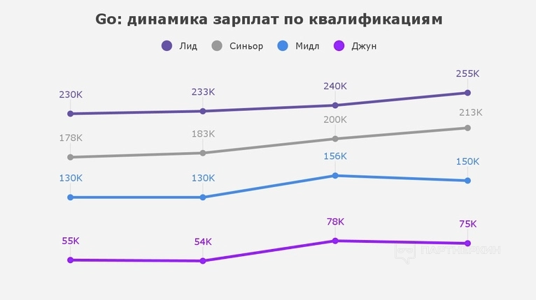 Как показывает сервис Zarplan, средний заработок Go-разработчика в РФ достигает 315 452 рублей в месяц. В целом специалисты с разным уровнем мастерства зарабатывают от 153 000 до 600 000 руб/месяц.
