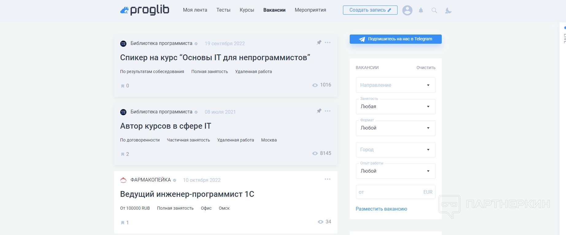 Поискать вакансии можно в тематических телеграм-каналах. Подойдут следующие паблики: «Вакансии для программистов», «Ит Вакансии / Работа программиста», «Вакансии разработчиков / программистов».