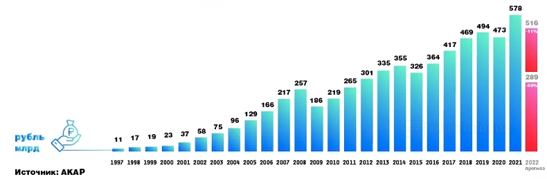 Как показывают исследования АКАР, суммарный объем рекламы в средствах ее распространения за первую половину 2025 года составил 245-250 млрд. руб. А концу года отметка должна приблизиться к 515 млрд. руб.