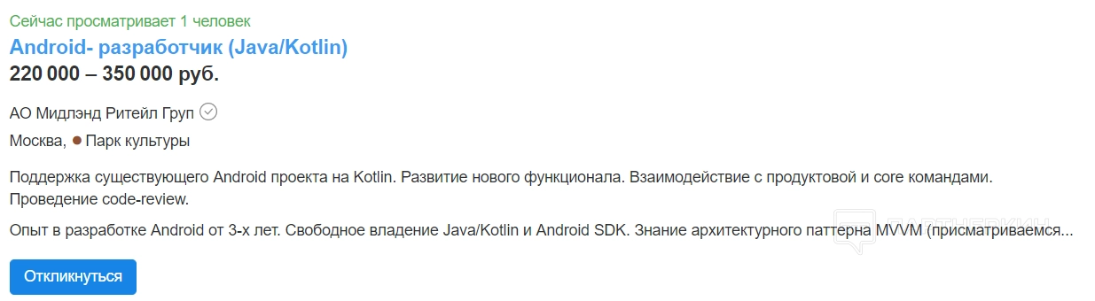 В среднем, разработчик Kotlin может получать в районе 278 179 рублей в месяц, по данным Zarplan. По городам России похожая ситуация.