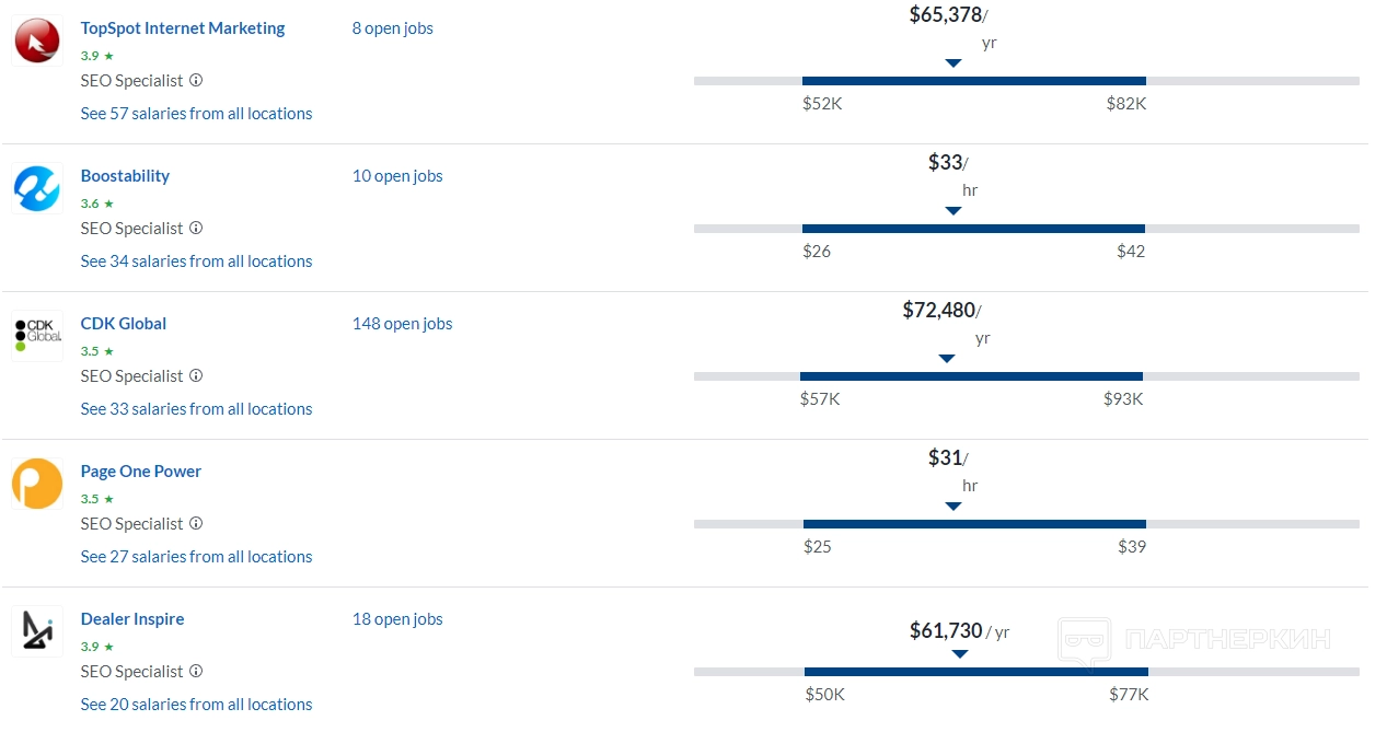 По данным портала Zarplan, средняя зарплата SEO-специалистов в РФ достигает 75 000 рублей в месяц. В целом же сеошники в России зарабатывают от 41 000 до 121 000 руб/месяц. Как правило, самые большие гонорары обещают в московских и питерских компаниях. В этих же городах наибольшее количество вакансий.