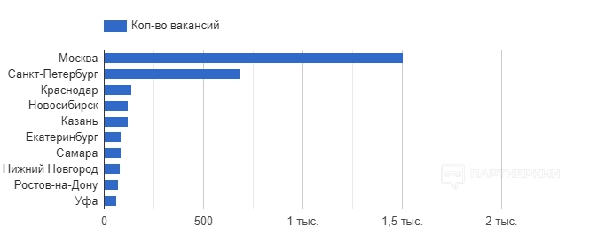 Самые высокие ЗП предлагают московские организации. Также неплохо зарабатывают в Санкт-Петербурге и Новосибирске. Больше всего вакансий можно найти в МСК и СПБ.