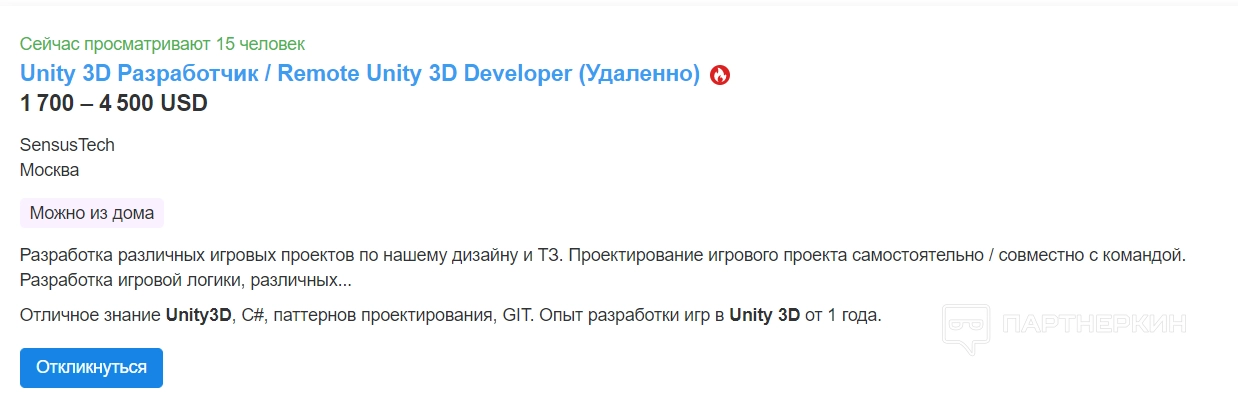 Unity — это движок в основном для создания игр, но на нем также можно писать различные бизнес-приложения. Около 50% всех игр писали именно на Unity, поэтому движок сильно распространенный и востребованный. С его помощью можно делать игры для ПК, смартфонов, VR и для многих других средств для воспроизведения игр. Хоть существует множество других движков, которые иногда даже удобней в работе, Unity продолжает занимать лидерские места по востребованности. Поэтому специалисты по разработке игр на этом движке тоже нужны многим компаниям.