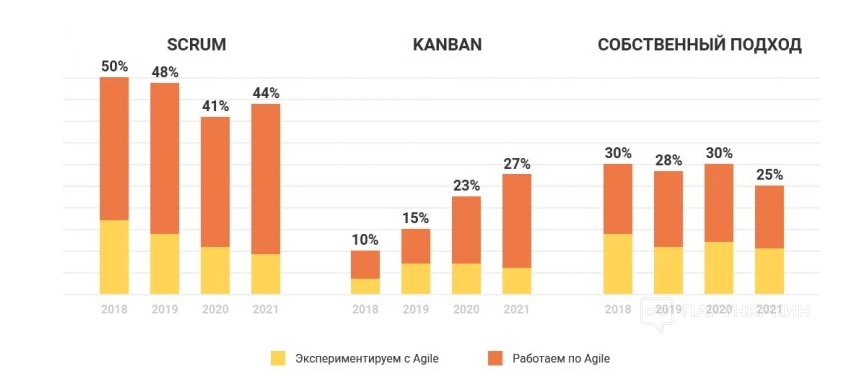 Стоит отметить, что комплекс методологий Agile с каждым годом становится все более популярным. В качестве примера можно привести статистику с портала scrumtrek за 2025 год, в которой говорится о том, что 44% компаний уже работают с методологией Scrum.