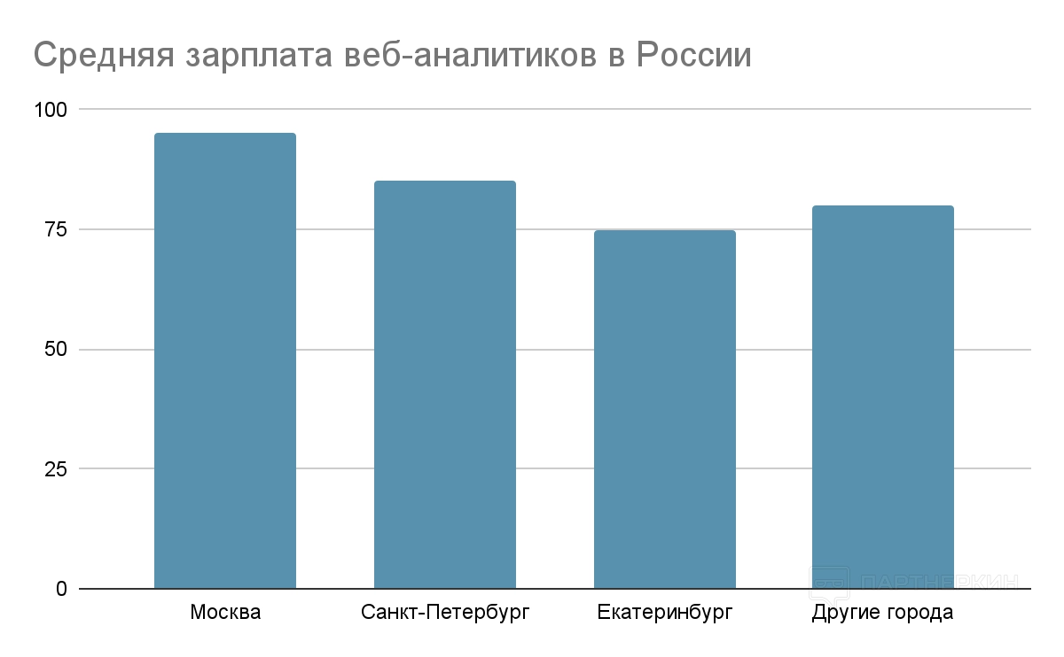 Как видно из статистики, наибольшую зарплату получают web-аналитики в Москве - 95 000 рублей в месяц. В Санкт-Петербурге средняя зарплата web-аналитика составляет 85 000 рублей в месяц, а в Екатеринбурге - 75 000 рублей в месяц.