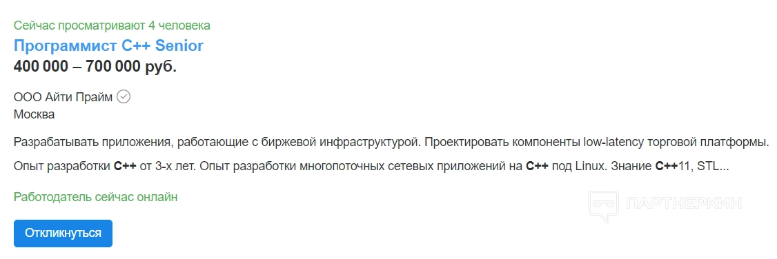 Работа программистом в штате оплачивается лучше, поэтому можно ориентироваться на такие вакансии. Их можно найти на сайтах hh.ru, работу.ру, Хабр Карьера — здесь регулярно публикуют интересные вакансии на каждый уровень. То есть ищут и джунов, и сеньоров. Некоторые компании могут публиковать удаленные или part-time вакансии.