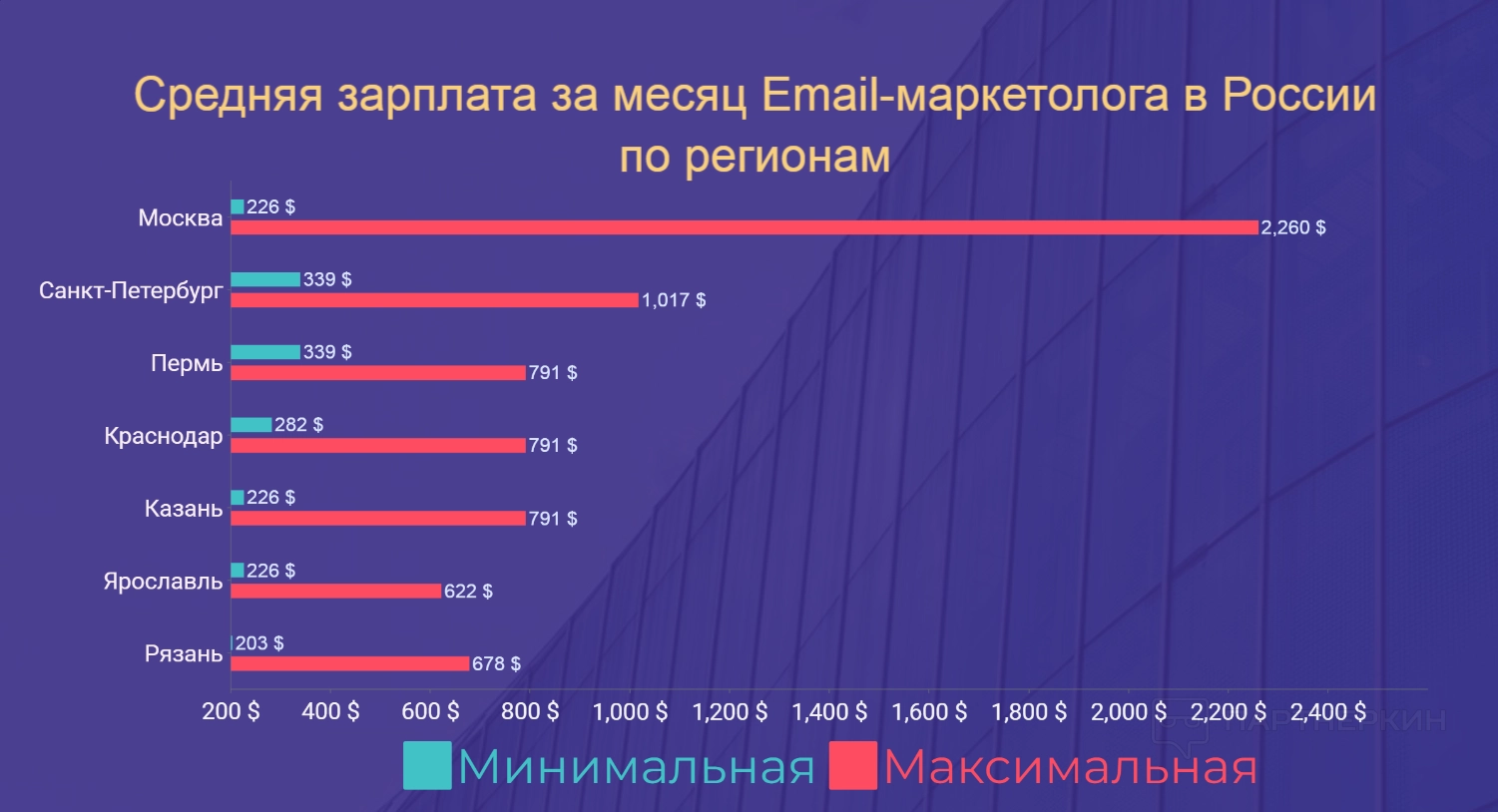 В данной области доход зависит от нескольких факторов. Во-первых — это личный опыт и прежние места работы. Специалист с опытом и портфолио, в котором есть успешные кейсы, ценится выше, чем новичок. В целом начинающие Email-маркетологи получают $200-500 в месяц. В то время, как у сеньоров доход может вырасти до $2 000.