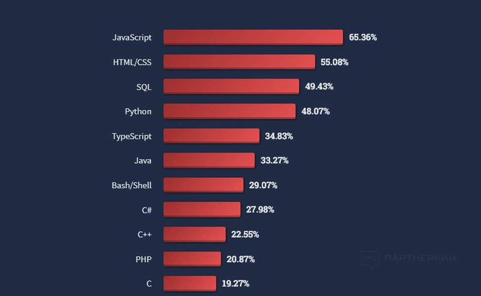 Согласно опросу StackOverflow, самыми популярными языками программирования считают JavaScript, HTML / CSS и Python, поэтому они вошли в топ-5. Однако профессионалы выбирают SQL, TypeScript и Bash.