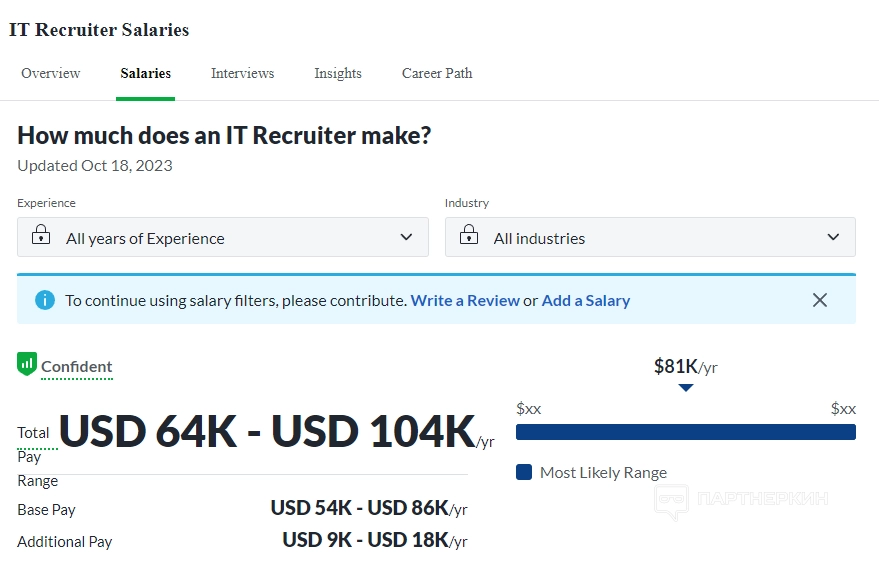 Заработки IT-рекрутеров в США гораздо выше. Да и вакансий в Америке намного больше. Как показывает сервис GlassDoor, специалисты с разным уровнем компетентности зарабатывают от $64 000 до $104 000 в год. Средняя зарплата — $81 000 в год.
