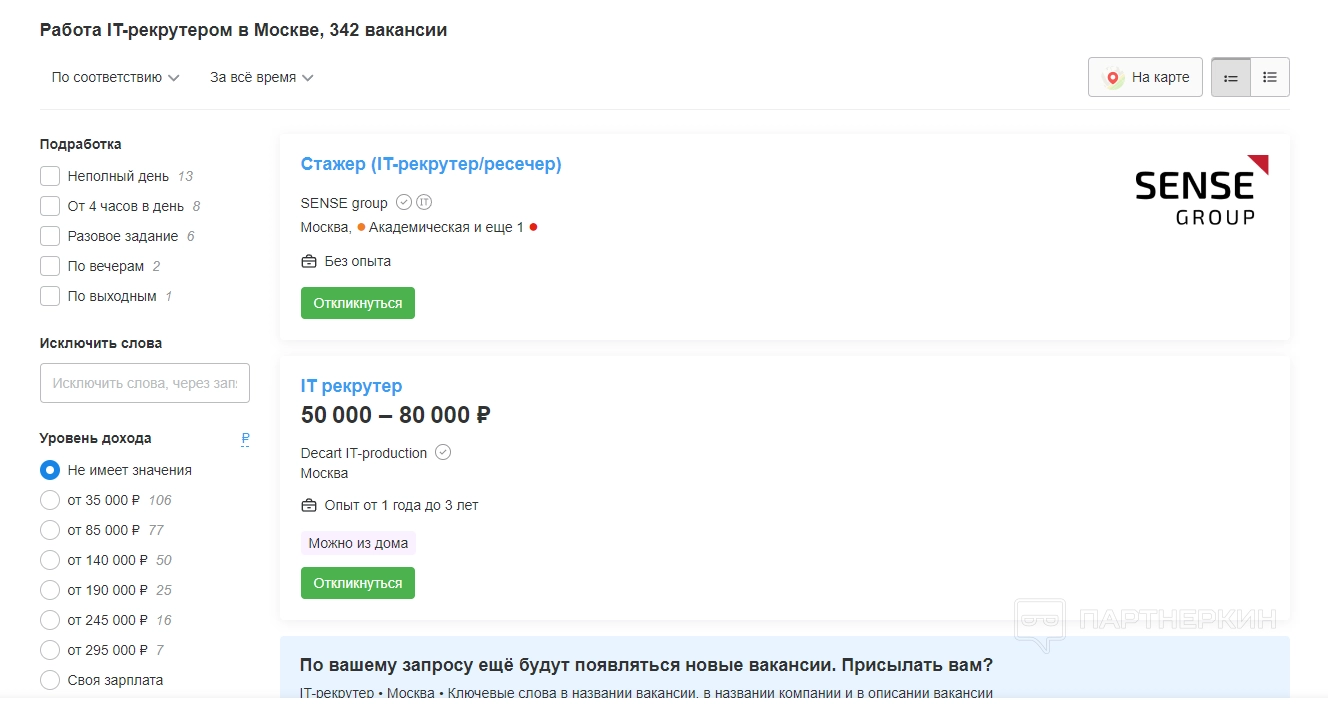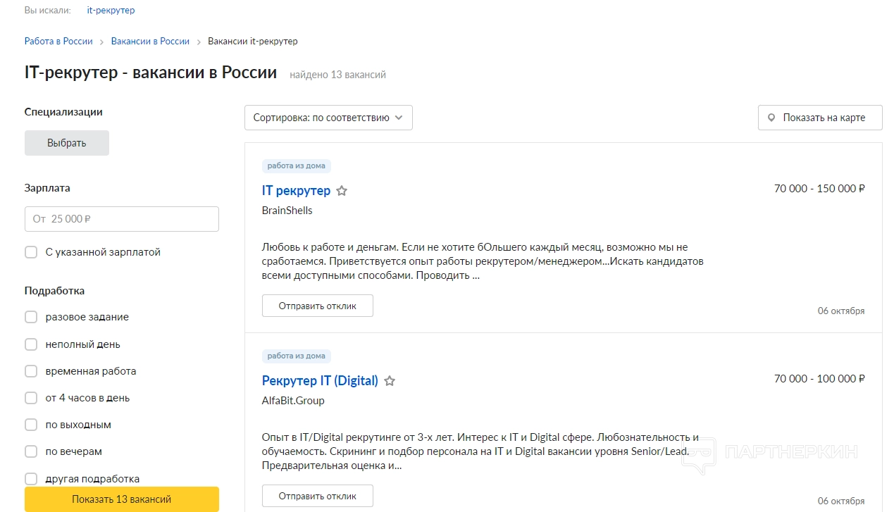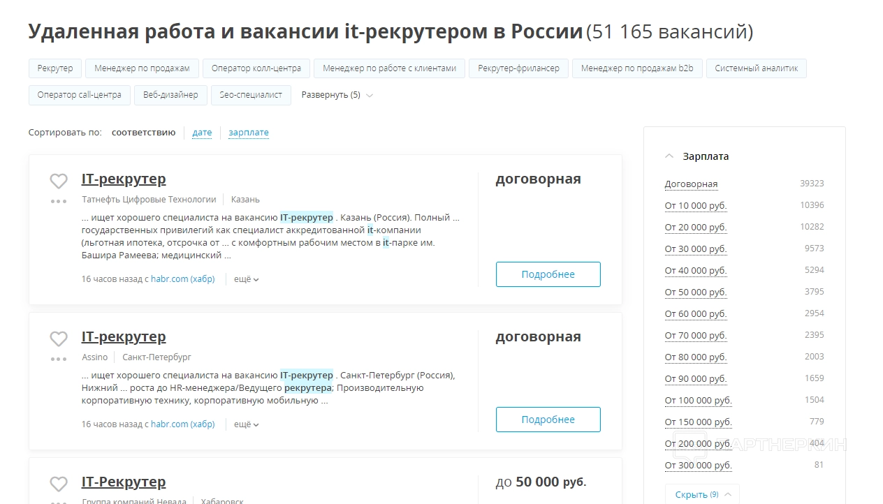 Поиск работы IT-рекрутером можно начать в сервисе HeadHunter. На момент написания статьи здесь можно было найти по Москве свыше 300 вакансий со средней зарплатой 140 000 рублей в месяц.