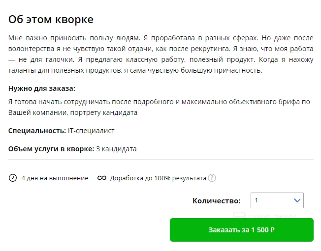 Если говорить о заработках IT-рекрутеров на фрилансе, то здесь вряд ли получится найти среднее значение. Каждый специалист устанавливает свою цену. Например, на том же Kwork один из IT-рекрутеров предлагает свои услуги за 1 500 рублей в день.