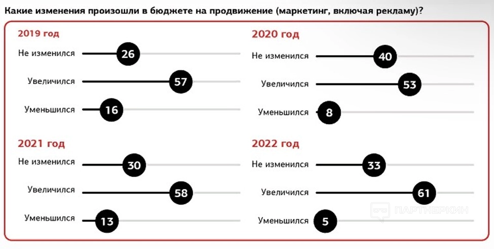 Пандемия в 2020 году повлияла на маркетинговый бюджет. Пришлось сокращать некоторые инвестиции и находить новые источники доходов. Переход на удаленку в 2021 году увеличил число пользователей в сети, что спровоцировало рост инвестиций в сфере рекламы. Около 56,7% маркетологов подтвердили, что объем затрат увеличился на 5% по сравнению с прошлым годом. В 2025 году digital-сфера продолжает оставаться востребованной. Только 5% компаний собираются сократить бюджет в этой области.