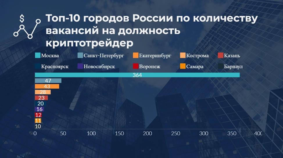 Работа криптотрейдером отличается от стандартных должностей. Просто найти на обычных платформах предложение тяжело. Количество вакансий в Москве составляет 364 шт. В других городах этот показатель ниже.