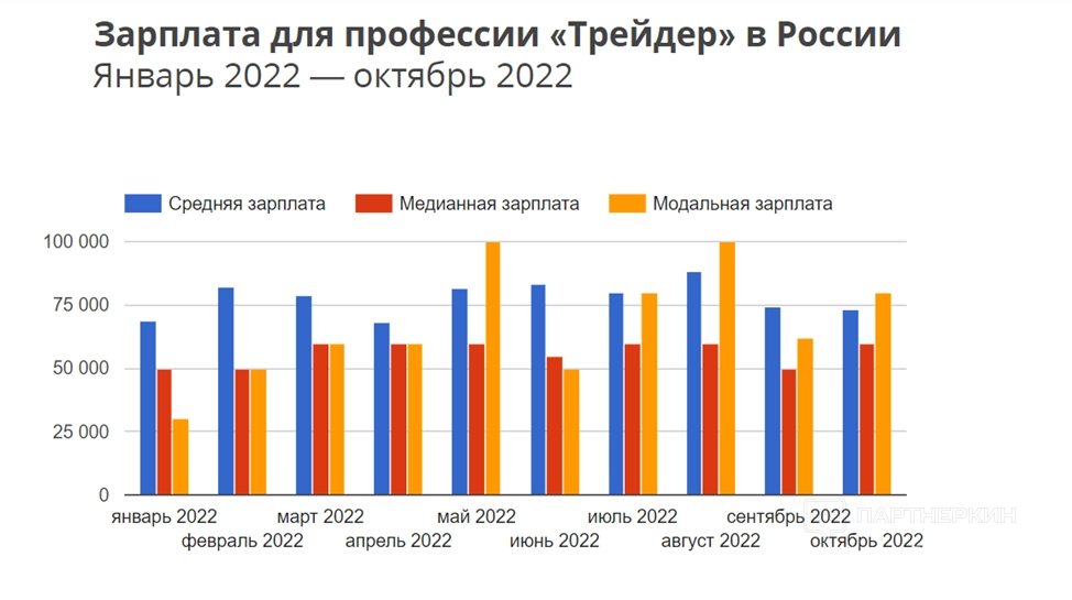 По данным ГородРабот.Ру, средний оклад трейдера на территории РФ составляет 73 052 рубля. Это не считая переработок, отпускных, комиссий и переплат. За месяц заработная плата изменилась на 1,7% в сторону увеличения (с 74 326 до 73 052 рубля). Часто в вакансиях встречается модальная зарплата — 80 000 рублей.