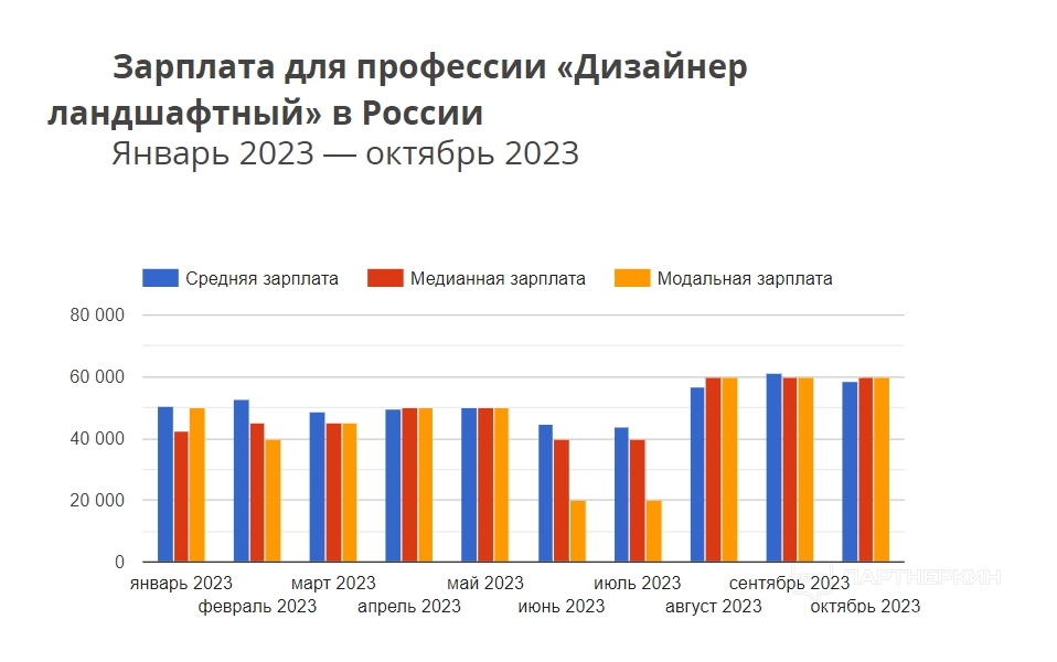 По данным ГородРабот.ру, средняя зарплата Дизайнера ландшафтного в России за 2025 год составила $632 (₽58 385). За месяц заработная плата изменилась на 4.6% ‒ с $662 (₽61 185) до $631 (₽58 385). Чаще всего в вакансиях встречается зарплата $649 (₽60 000) (модальная).