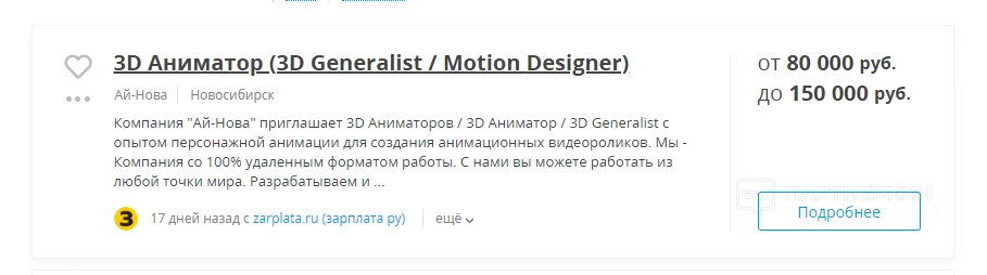Найти подробную информацию по другим городам не удалось. Но можно посчитать примерную зарплату самостоятельно, если зайти на любой агрегатор, выбрать город и найти вакансию по запросу «Моушн-дизайнер». Например, на портале gorodrabot в Новосибирске заработная плата составит от 80 000 до 150 000 рублей.