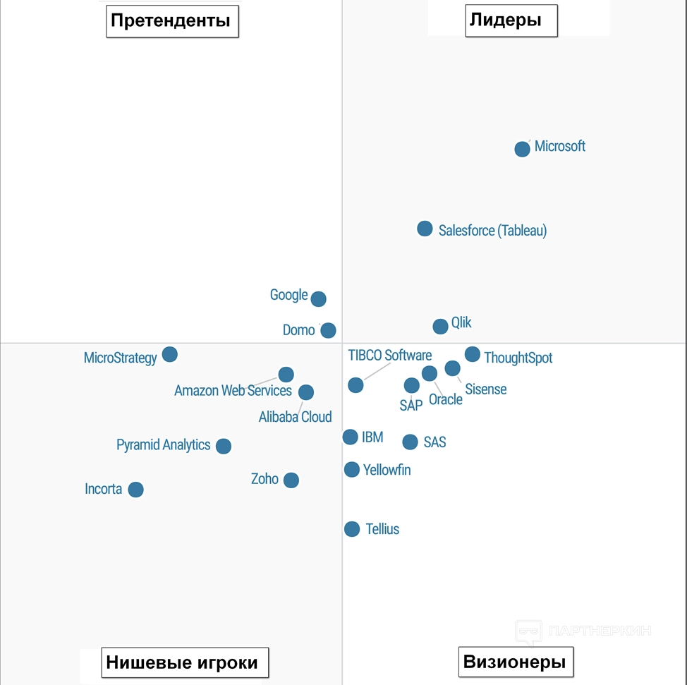В 2025 году Power Bi продолжает лидировать. Согласно квадранту Гарднера, Microsoft возглавляет рейтинг.