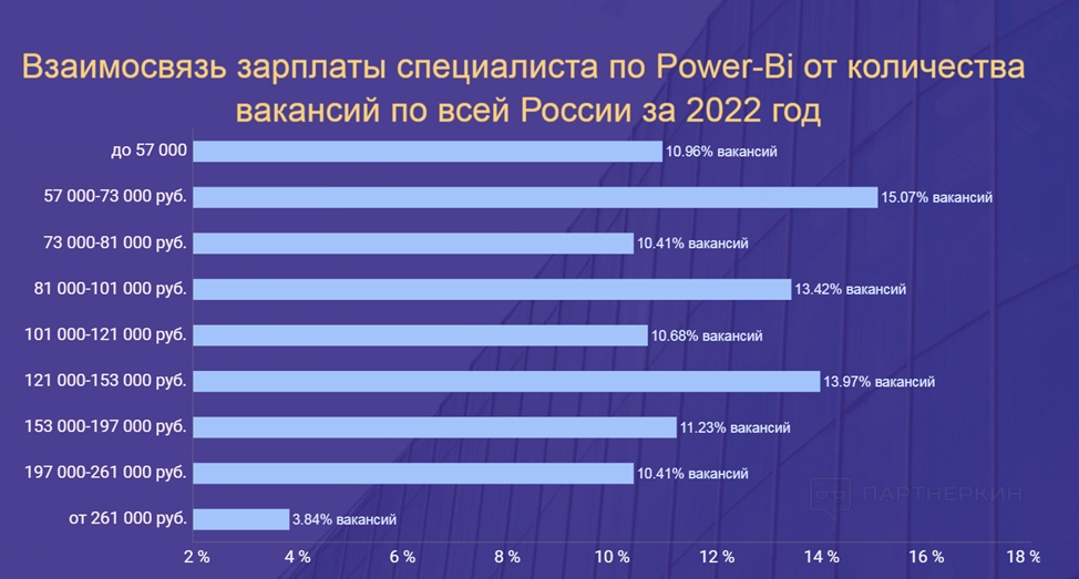 Средний оклад за месяц специалиста по Power-Bi находится в пределах 123 142 рубля. Это не учитывая надбавки, отпускные и переработки. Однако в вакансиях чаще встречается медианная зарплата — 103 000 рубля.