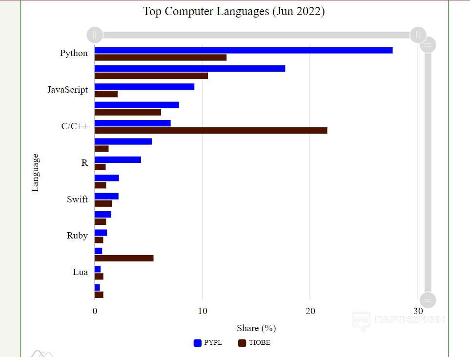 По рейтингу PYPL Python занимает первое место по востребованности в мире. Рейтинг TIOBE демонстрирует, что язык на втором месте по популярности, хотя в 2024 году он также занимал первое место.