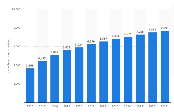 Сейчас разработчик мобильных приложений — одна из самых востребованных направлений в IT-сфере. Об этом свидетельствуют данные сервиса Statista, в которых говорится о том, что смартфонам и их программными продуктами в 2025 году пользуются уже свыше 6,5 млрд. людей. А к 2027 году эта цифра вырастет до 7,6 млрд.