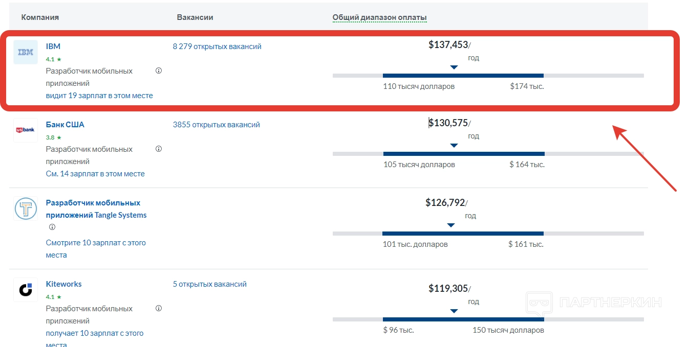 В США средний доход опытного разработчика достигает $97 422 в год. Некоторые компании платят намного больше. В качестве примера можно привести корпорацию IBM, где на момент написания статьи было опубликовано свыше 8 000 вакансий со средней ЗП $137 453 в год. Общий диапазон – от $110 000 до $174 000 в год.
