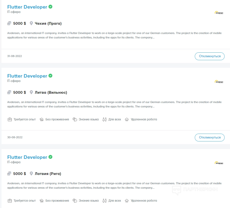 Для поиска работы за границей можно воспользоваться порталами usa.hh, euro-rabota и layboard. Последний, кстати, примечателен тем, что предлагает работу по разным странам Европы. Например, на момент написания статьи в Чехию, Литву и Латвию требовались специалисты по Flutter, которым предлагалось до $5 000 в месяц.