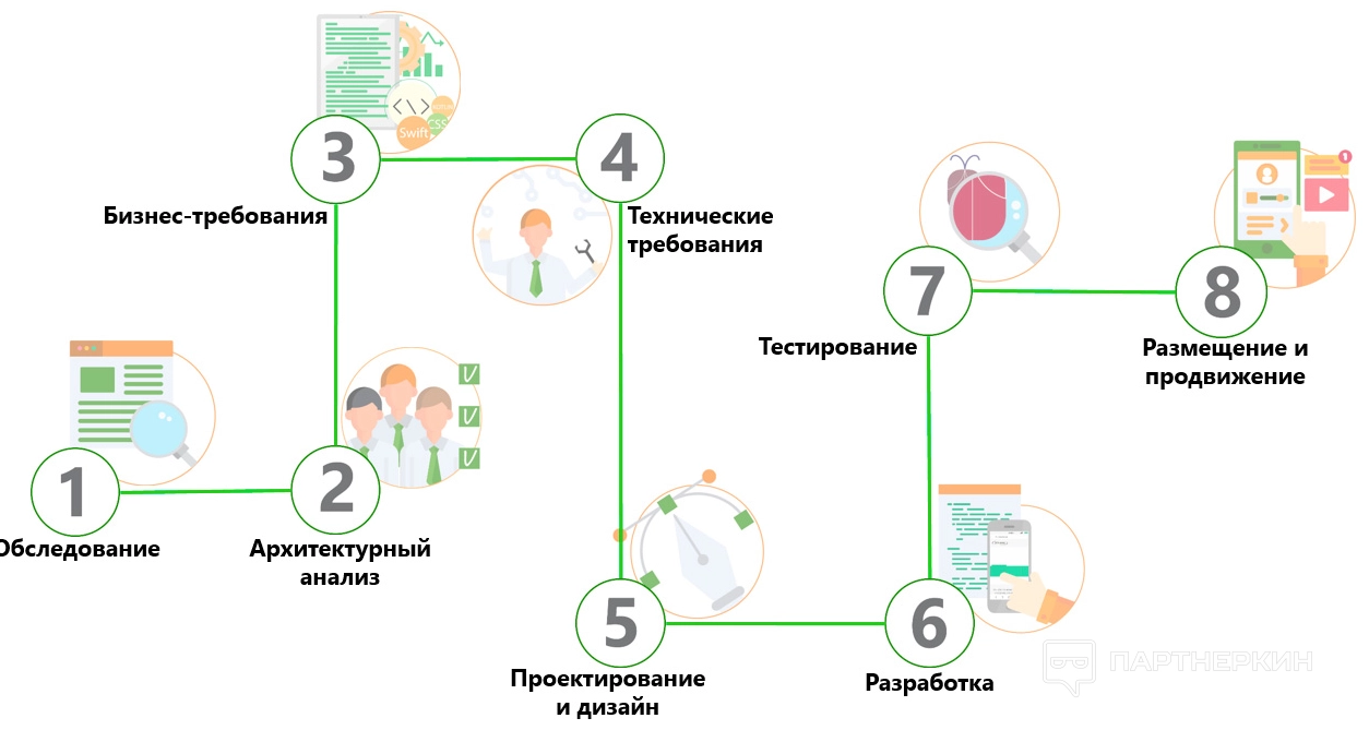 Разработка любого мобильного приложения состоит из следующих этапов: