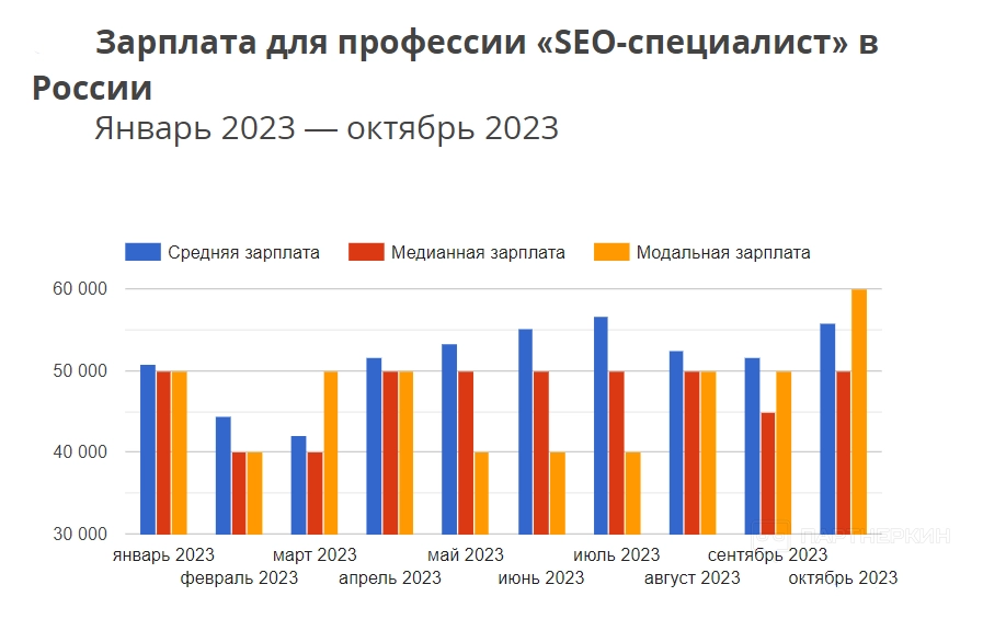 По данным ГородРабот.ру, средняя зарплата SEO-специалиста в России за 2025 год составляет $609 (₽55 733). За месяц заработная плата изменилась на 8% ‒ с $564 (₽51 605) до $609 (₽55 733). А чаще всего в вакансиях встречается зарплата $656 (₽60 000) (модальная).