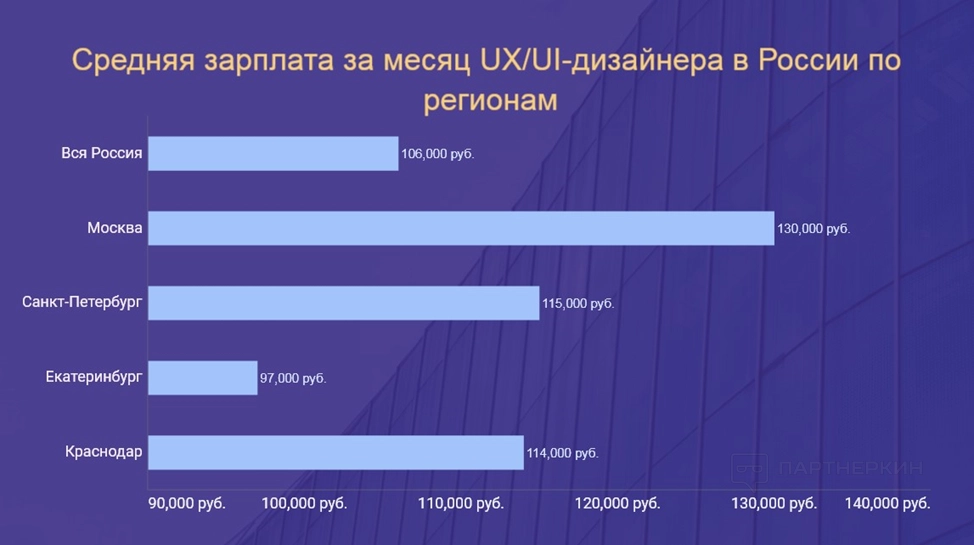 По данным сайта Работа.ру, средняя зарплата UX/UI-дизайнера в России за 2025 год составляет 106 000 рублей в месяц. В Москве и Санкт-Петербурге этот показатель выше – около 130 000 рублей.